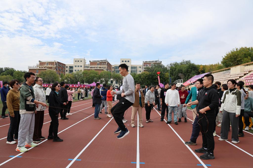 参赛教职工们全神贯注、紧密配合,随着长绳的规律摆动,队员们身影轻盈、衔接流畅,展现出纯熟的个人技巧与优秀的团队默契,生动诠释了协同协作、步调一致的集体精神。